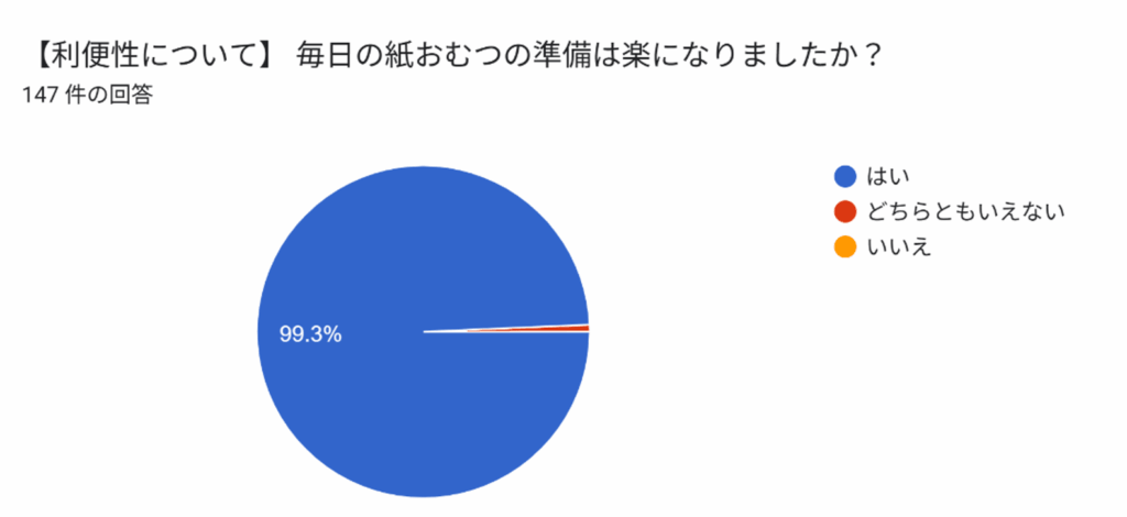 実際に相模原市立の保護者様にご協力いただいたアンケートでも、「毎日の紙おむつの 準備は楽になりましたか?」の質問に対して99%の方が楽になったと答えています。「朝 の準備と確認の手間がなくなって負担が減った」などのお声をいただいています。