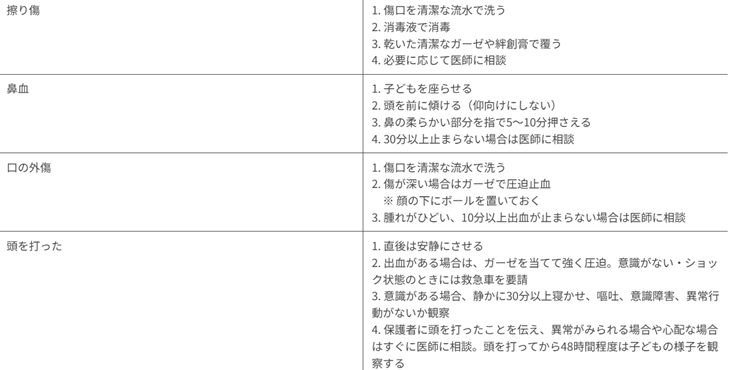 また、突然の怪我で不安が強くなる子どもも多いため、優しい声かけや寄り添う姿勢を心がけ、心理的に落ち着ける状態をつくることも重要です。