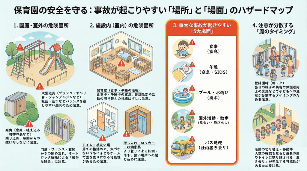 例えば「滑りやすい床」「角のある家具や備品」「混雑した遊び場」など危険の“芽”は意外と身近にあります。